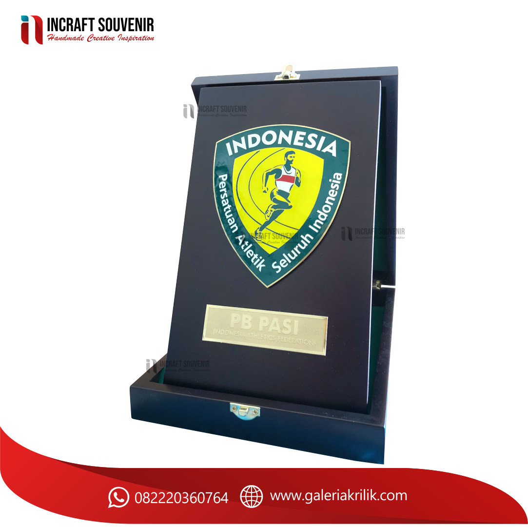 Plakat kayu merupakan produk plakat yang eksklusif dan elegan. Plakat kayu dengan sentuhan kombinasi plat kuningan menjadikan plakat kayu banyak sekali diminati baik instansi pemerintah, BUMN, Universitas dan juga perusahaan – perusahaan swasta. Produk plakat kayu ini terkenal dengan nilai kemewahanya dengan kombinasi kuningan croom emas dan tentunya dilengkapi dengan kotak bludru / batik menambah nilai eksklusufitas plakat kayuini.